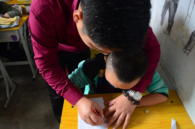 在和這些孩子們的接觸過(guò)程中,我們發(fā)現(xiàn),雖然他們的生活條件不是太好,自身或多或少的有些殘疾,但這些孩子并沒(méi)有我們之前所想象的那樣孤僻,反而是個(gè)個(gè)面帶著燦爛的笑臉,保持著積極樂(lè)觀的生活態(tài)度。這些孩子中有的畫畫的很好,有的字寫的很漂亮,還有的孩子興高采烈地拉著我的手讓我給他照相……我們所有人都融入到這群孩子當(dāng)中,教給他們寫字,和他們一起玩耍、做游戲,而他們也教會(huì)了我們不管生活有多艱苦,都應(yīng)該報(bào)以一顆感恩的心去勇敢地面對(duì)生活。
